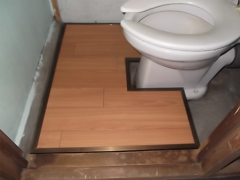 床の嵩上げを行うと共に、それによって低くなった便座のままでは立ち座りが不便な為、同じ高さの補高便座を置きました。